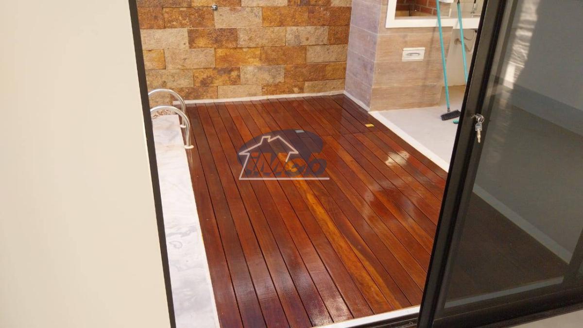 * Piscina com cascata, deck de madeira, iluminação de led e chuveirão.